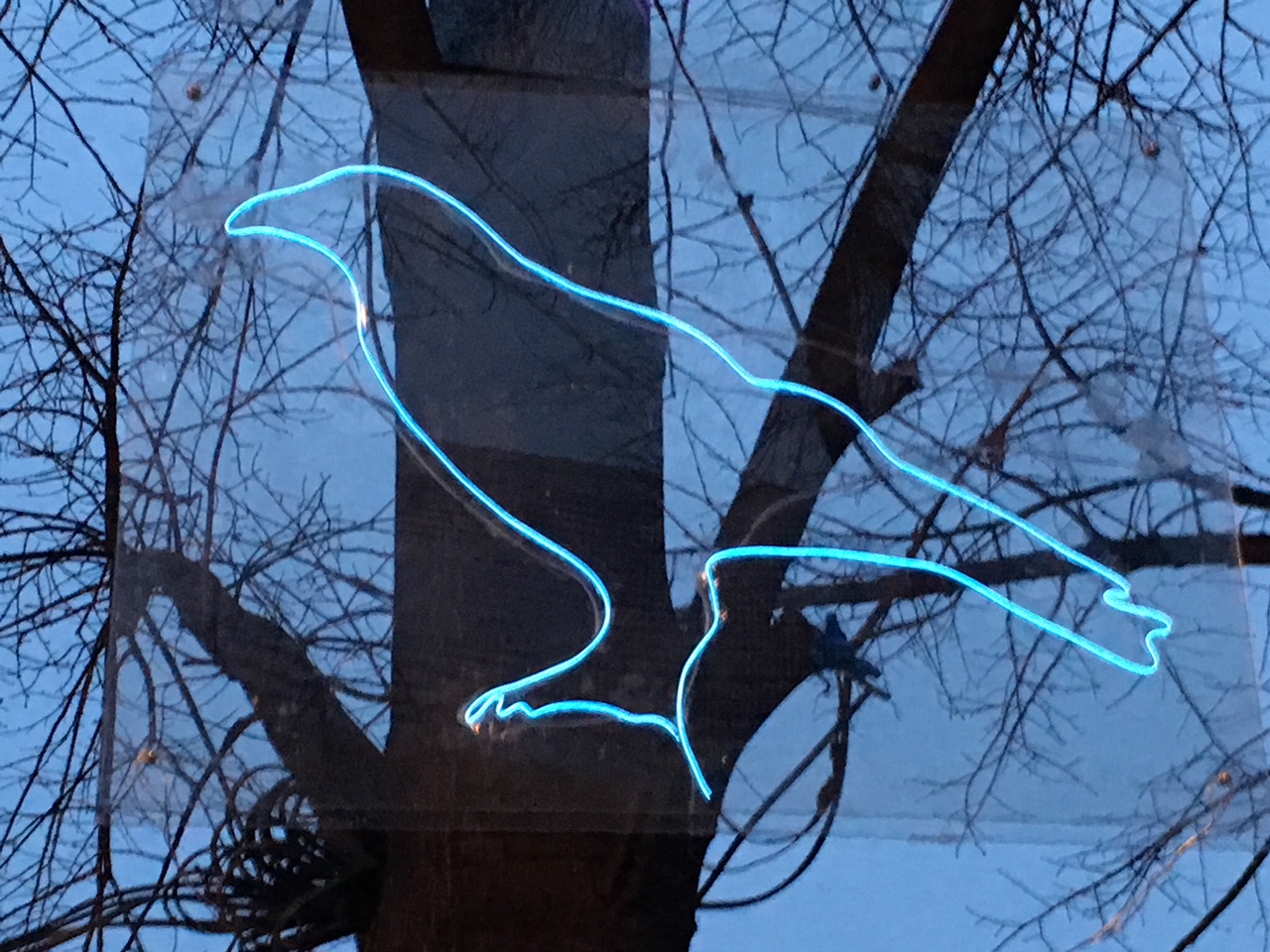 Our public art piece Aviary, created by Michael Koch-Schulte and myself with the help of Lights Unlimited took on yet another form at the North Dakota Museum of Art. As part of their bi-annual auction, the installation took the form of electro-luminescent birds and our sound houses which focused on crow and raven calls from the Cornell Museum. Click here for the video.