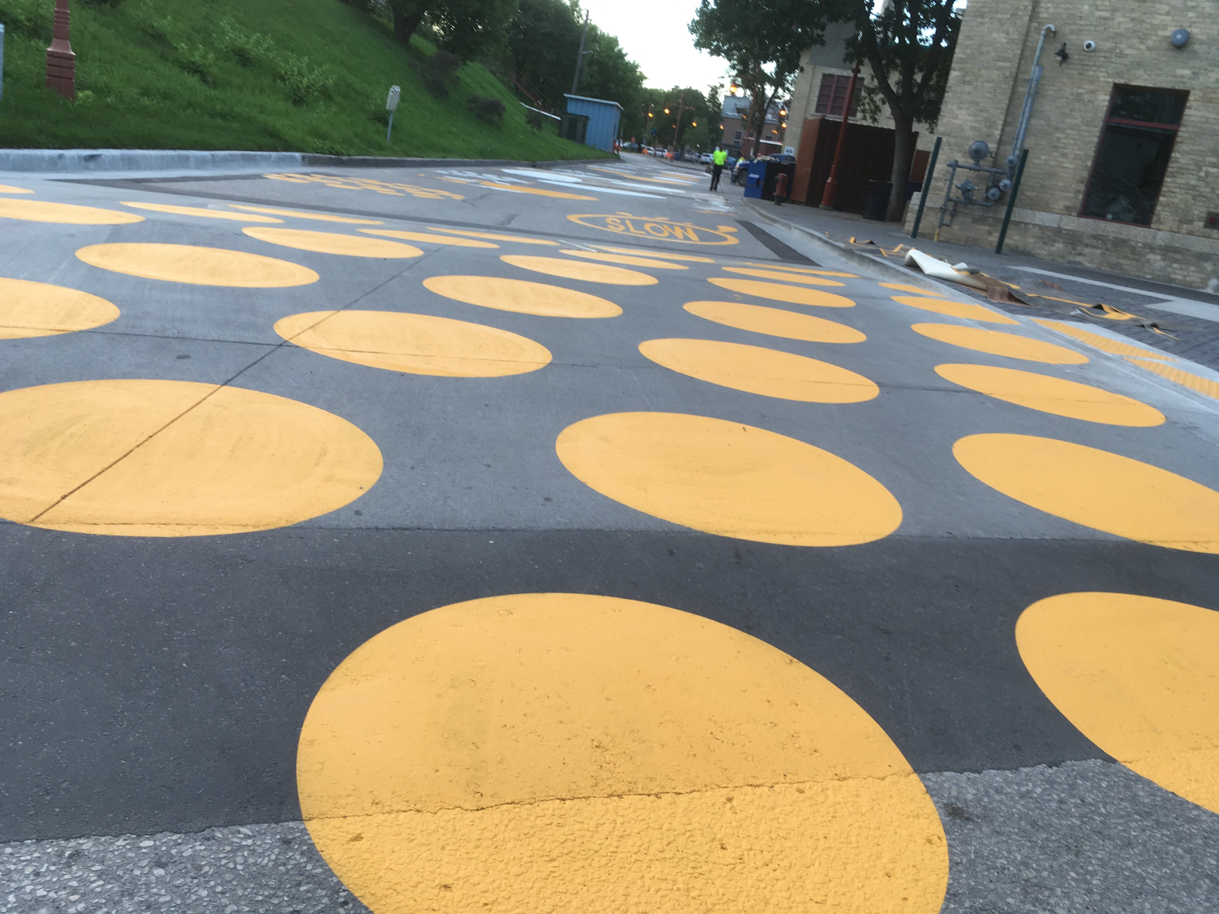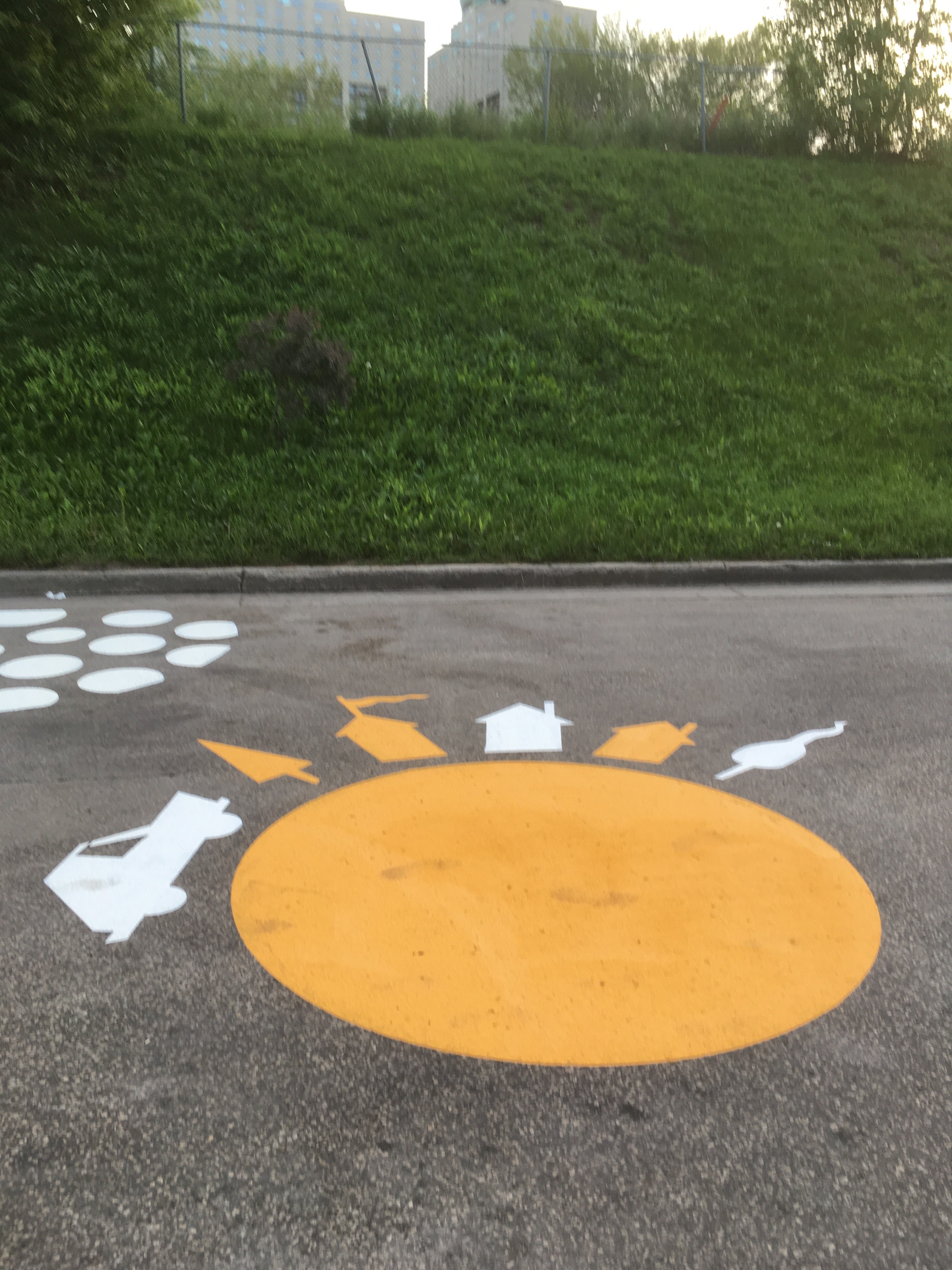 We had the chance to work with a couple great artists/designers at the Forks here in Winnipeg and installed two wonderful art installations. The first one, designed by Takashi Iwasaki, was a 700′ long piece of street art. We created the series of stencils using a waterjet and painted the area with our good friends at Curb 2 Curb. What a project!