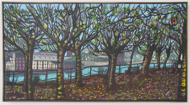 This painting called Frankfurt, Along the Main is of the Main river that runs through Frankfurt. This one has had a lot of interest as of late….there’s something cold and lonely about Germany in January and I think I captured it here. The thing that warms it up for me is there’s a couple walking hand in hand at the corner of the painting. It currently hangs at The Falafel Place in Winnipeg but I have a feeling it’ll be gone soon. I’m going to miss it…25″ x 49″, acrylic on canvas with an oak frame, $1800.00 Cdn. SOLD
