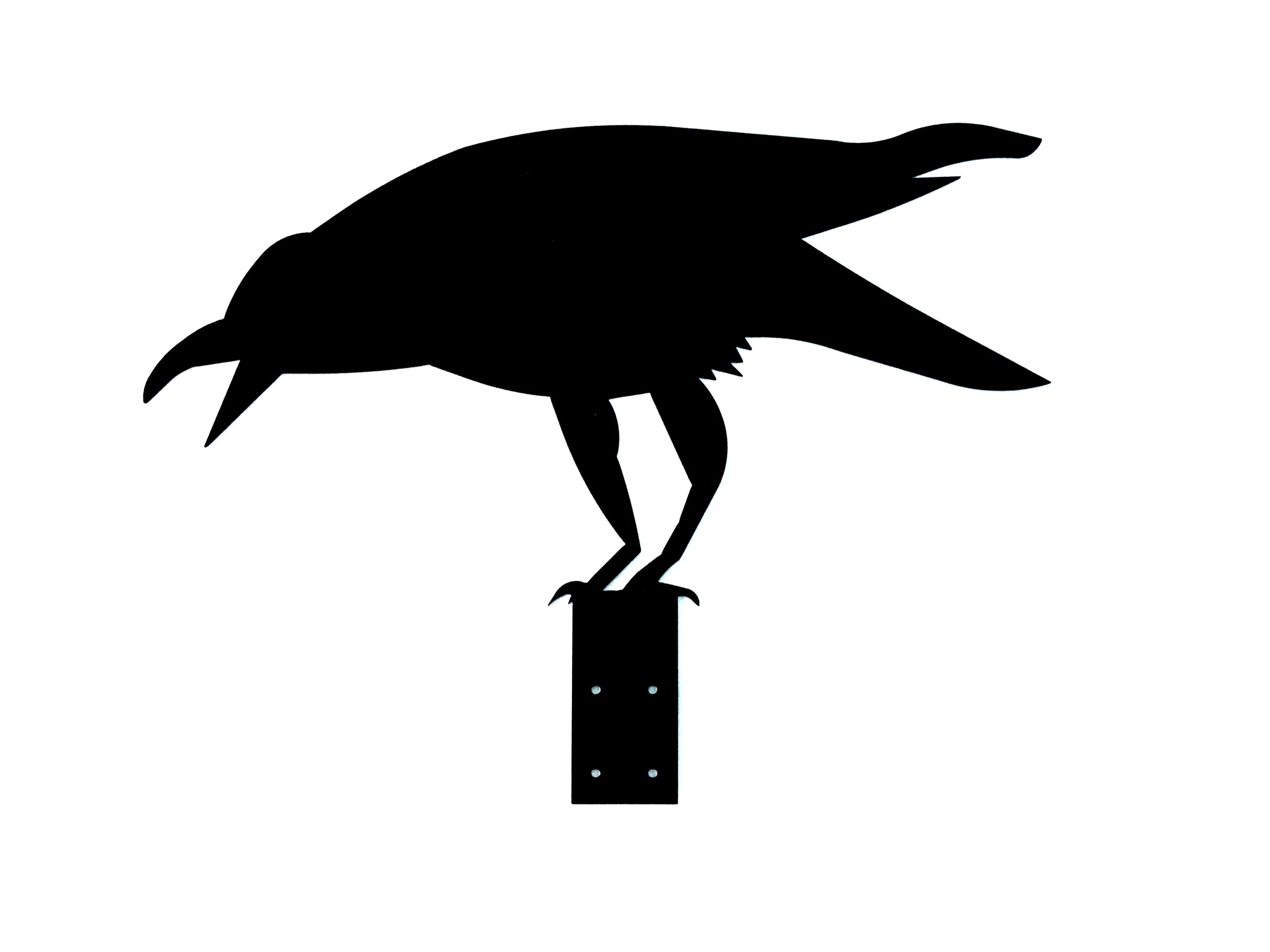 Steel crow cut from 1/4″ steel and powder-coated black. Comes with mounting holes.