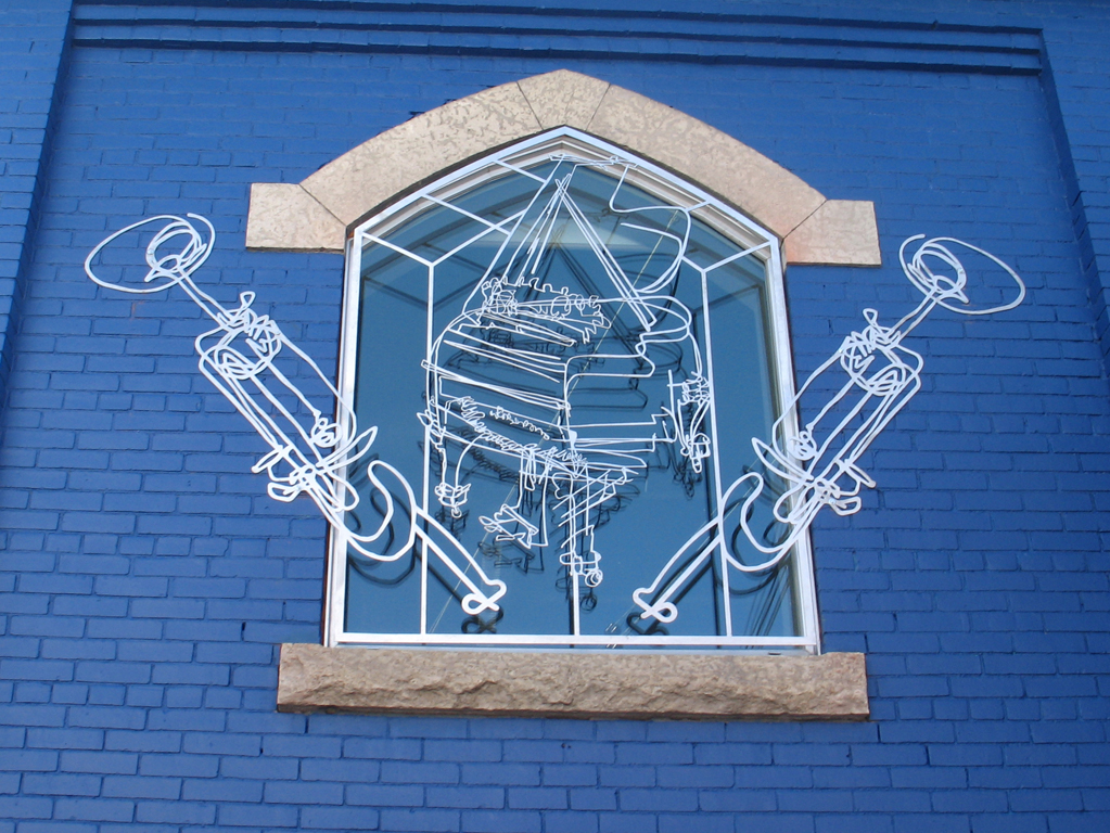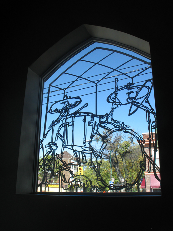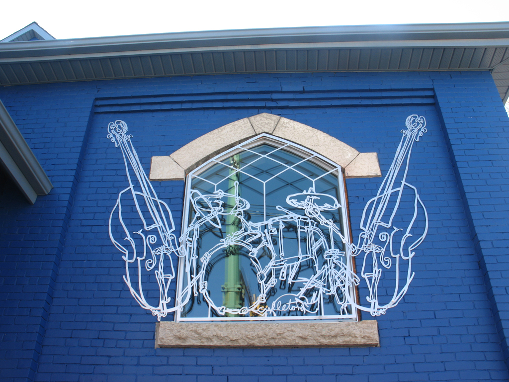 In 2010 James Culleton was awarded the commission to recreate the facade of the West End Cultural Centre, one of Winnipeg’s greatest musical venues. For a year Culleton drew imagery from the WECC’s history and came up with a design that recreated his drawings from that study cut out of steel and aluminum using a CNC water jet.